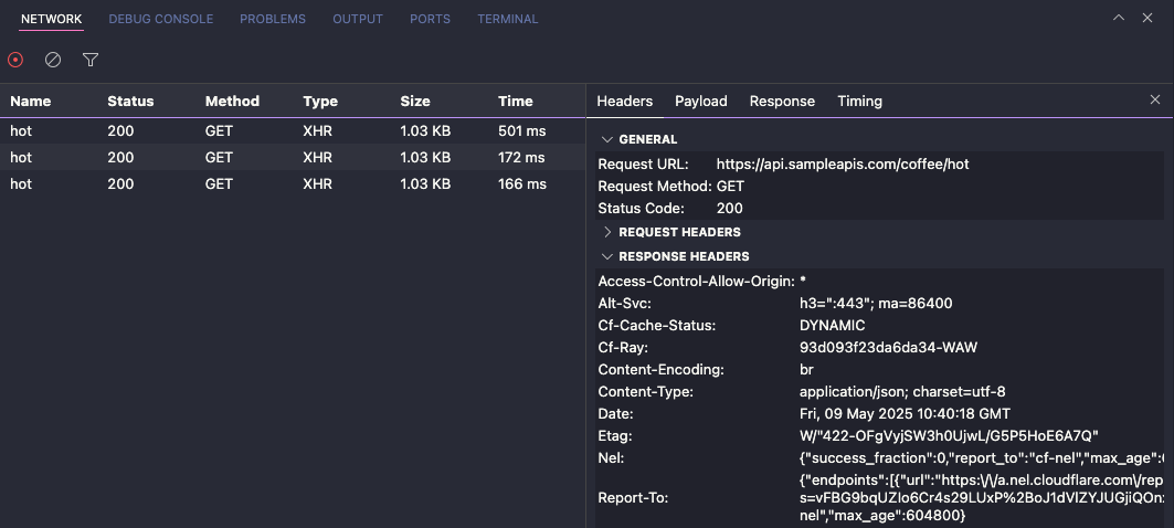Radon IDE comes with a Network Inspector panel allowing you to inspect network traffic. The tool will capture and list all requests of fetch and XMLHttpRequest triggered by the JavaScript code. The panel works for both React Native CLI and Expo applications.