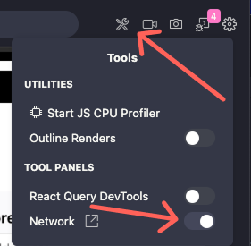 To enable the Network Inspector tab, first click the Tools button located on the top-right corner of the IDE. Then, enable the toggle next to the Network label. A new Network tab will appear in your editor.